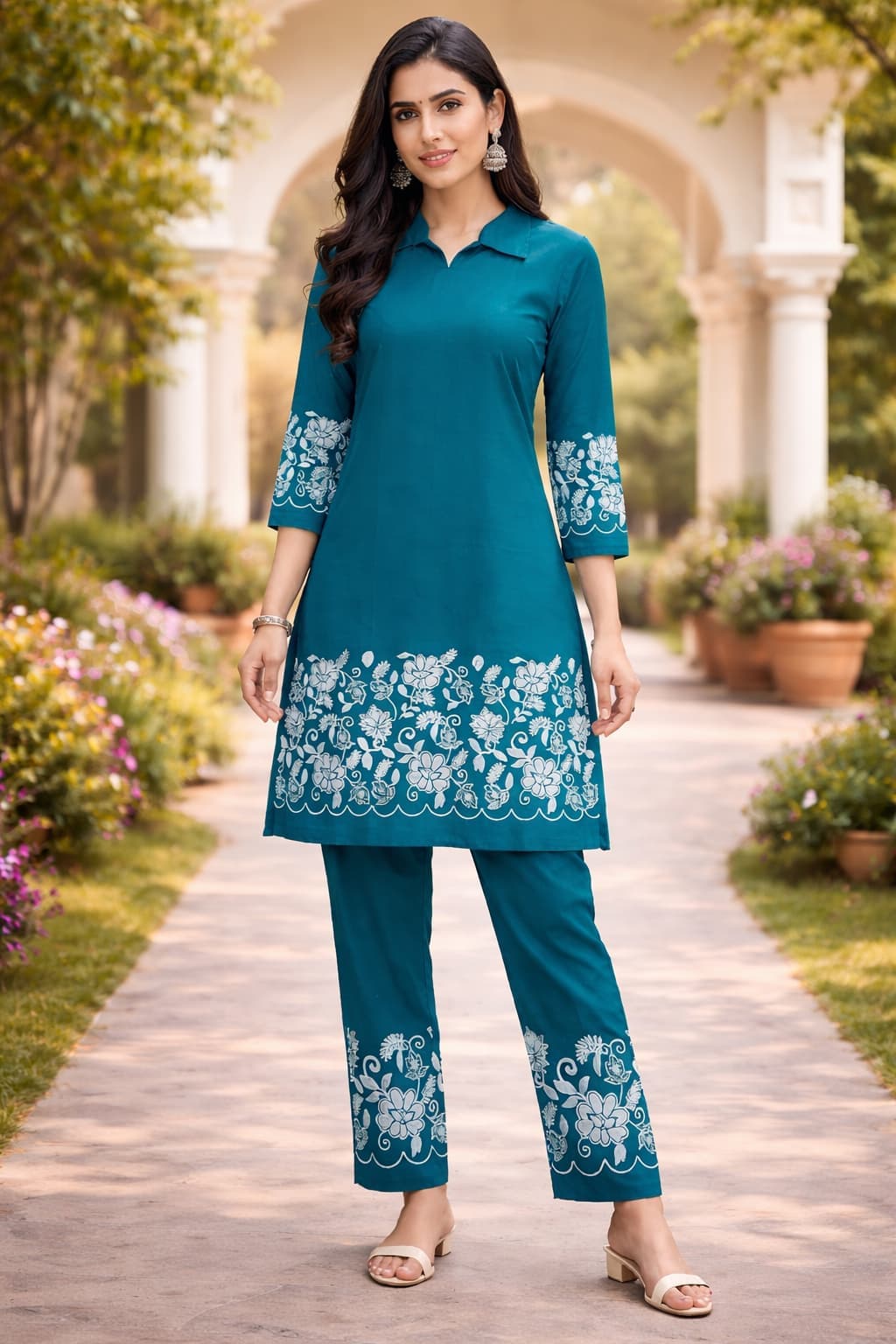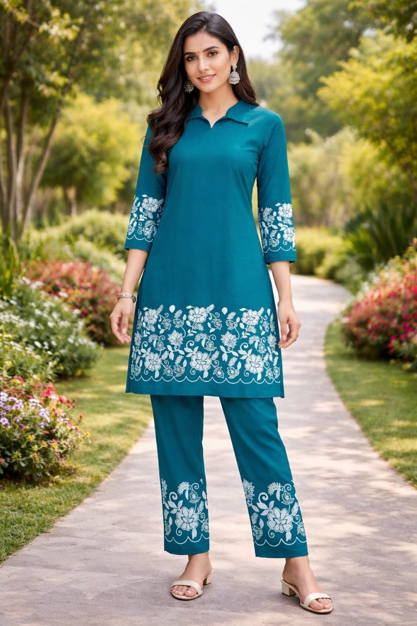 This teal kurti pant set is made from premium quality soft fabric that keeps you comfortable all day long. The kurti features a stylish collar neck design with 3/4 sleeves. Beautiful white floral embroidery print on the hem and sleeves gives it a stunning and elegant look. The matching pant also has the same floral print at the bottom for a complete coordinated look. The fabric is lightweight and breathable making it perfect for all seasons.
